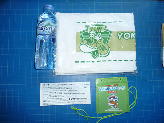 出発前にもらった参加賞のスポ−ツタオルとお水白い券はゴ−ル後いただいたベイスタ−ズの割引券