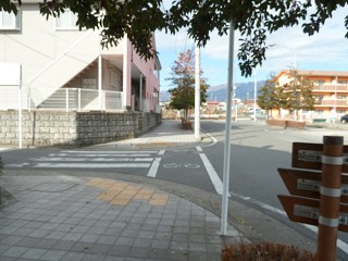 震生湖バス停を斜めに横断。