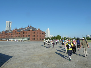 いよいよスタートします 7:52 快晴の中赤レンガ倉庫を回り、歩き始めました |